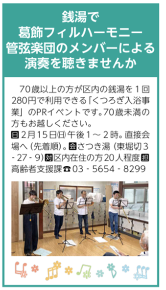 【イベント情報/2月15日/さつき湯】銭湯で葛飾フィルハーモニー管弦楽団のメンバーによるコンサート