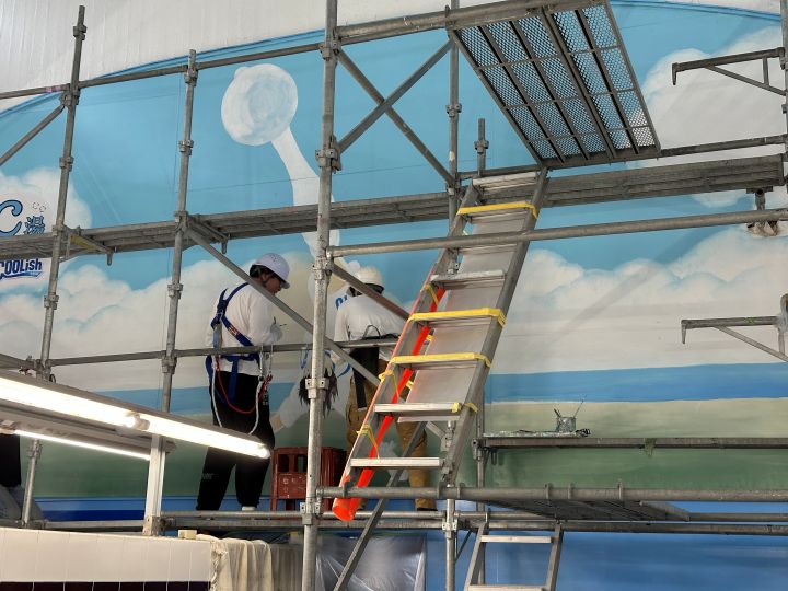 今回の(亀有)富士の湯のペンキ絵の背景画は、銭湯絵師の田中みずきさん指導の下、
