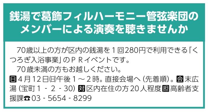 【イベント情報/4月12日/末広湯】銭湯で葛飾フィルハーモニー管弦楽団のメンバーによる演奏会