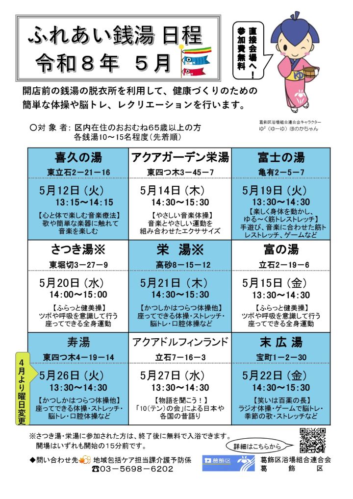 ※さつき湯・栄湯に参加された方は、終了後に無料で入浴できます。